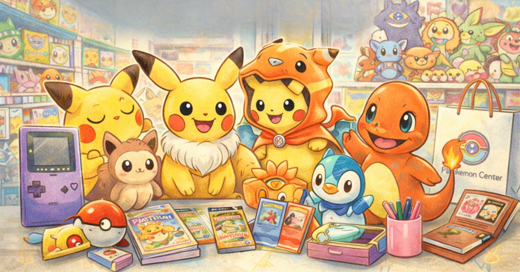 Popular Pokémon Center Japan product categories include plush toys, Pokémon TCG cards, gachapon items, stationery, apparel, home goods, and limited-edition collectibles released during special campaigns.